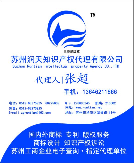 蘇州潤(rùn)天知識(shí)產(chǎn)權(quán)代理有限公司0512-68275925/北京潤(rùn)川知識(shí)產(chǎn)權(quán)代理有限公司是國(guó)家商標(biāo)局在蘇州地區(qū)/北京地區(qū)專(zhuān)業(yè)從事商標(biāo)注冊(cè)申請(qǐng)、續(xù)展、轉(zhuǎn)讓、商標(biāo)監(jiān)測(cè)、知識(shí)產(chǎn)權(quán)訴訟、蘇州軟件著作權(quán)登記\蘇州版權(quán)登記代理等知識(shí)產(chǎn)權(quán)服務(wù)的專(zhuān)門(mén)機(jī)構(gòu)。條形碼登記代理|蘇州商標(biāo)注冊(cè)|蘇州商標(biāo)|知識(shí)產(chǎn)權(quán)訴訟代理|蘇州商標(biāo)注冊(cè)公司|吳江商標(biāo)注冊(cè)公司|太倉(cāng)商標(biāo)注冊(cè)|太倉(cāng)商標(biāo)注冊(cè)申請(qǐng)|太倉(cāng)商標(biāo)注冊(cè)公司|昆山商標(biāo)注冊(cè)公司|吳江商標(biāo)注冊(cè)公司|商標(biāo)轉(zhuǎn)讓申請(qǐng)|商標(biāo)續(xù)展申請(qǐng)|商標(biāo)設(shè)計(jì)|蘇州LOGO設(shè)計(jì)|商標(biāo)查詢(xún)|商標(biāo)免費(fèi)查詢(xún)|蘇州工業(yè)園區(qū)商標(biāo)注冊(cè)|蘇州新區(qū)商標(biāo)注冊(cè)。蘇州潤(rùn)天知識(shí)產(chǎn)權(quán)代理有限公司 <蘇州潤(rùn)天知識(shí)產(chǎn)權(quán)代理有限公司 蘇州市吳中區(qū)蘇蠡路63號(hào)蠡諧大廈1007 電話:0512-68275925/68275639 傳真:0512-68275925 網(wǎng)址:://WWW.RUNTIAN.NET 法律顧問(wèn)單位:北京潤(rùn)川律師事務(wù)所 ://WWW.RUNCHUANLAW.COM |